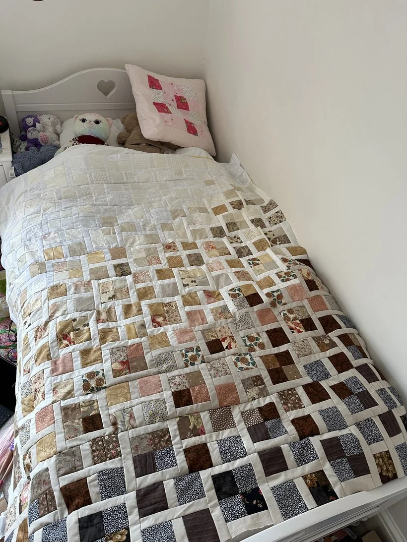 The initial challenge was combining the wildly disparate colors and prints from my scrap fabric box into a cohesive design, but pushing through that complexity made the final result so much richer. I tried to combine the colours so that they merged from darker to lighter. Using up the scraps felt like a small, personal sustainability victory.